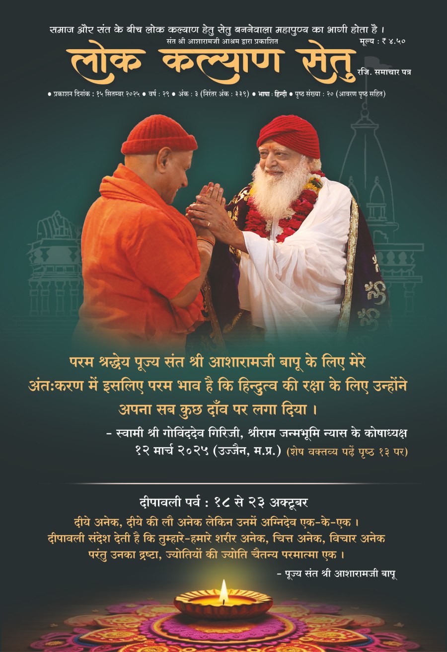 संत श्री आशारामजी आश्रम द्वारा प्रकाशित ‘लोक कल्याण सेतु’ मासिक समाचार-पत्र पिछले 23 वर्षों से समाज में नैतिक व चारित्रिक-मूल्यों के विकास तथा उनके संवर्धन में महत्त्वपूर्ण भूमिका निभा रहा है । इसके माध्यम से समाज को बौद्धिक विकास, आर्थिक समृद्धि व शारीरिक स्वास्थ्य की युक्तियाँ तो प्राप्त होती ही हैं, साथ ही शास्त्रों तथा संतों के ज्ञान से आत्मिक उन्नति का मार्ग भी प्रशस्त होता है । ‘लोक कल्याण सेतु’ देश-विदेश की सामयिक घटनाओं को समाज तक पहुँचाता है व ज्वलंत समस्याओं के जनहितकारी हल भी प्रस्तुत करता है ।